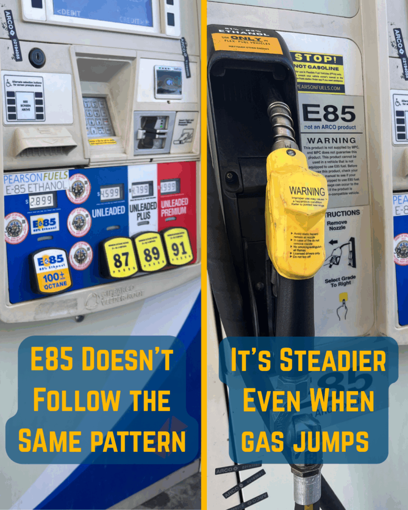 That means when the price of oil spikes, E85 doesn’t necessarily follow. While gasoline prices can fluctuate sharply based on factors outside California, E85’s pricing reflects more regional and agricultural trends. The result: a more predictable price curve and fewer surprises at the pump.